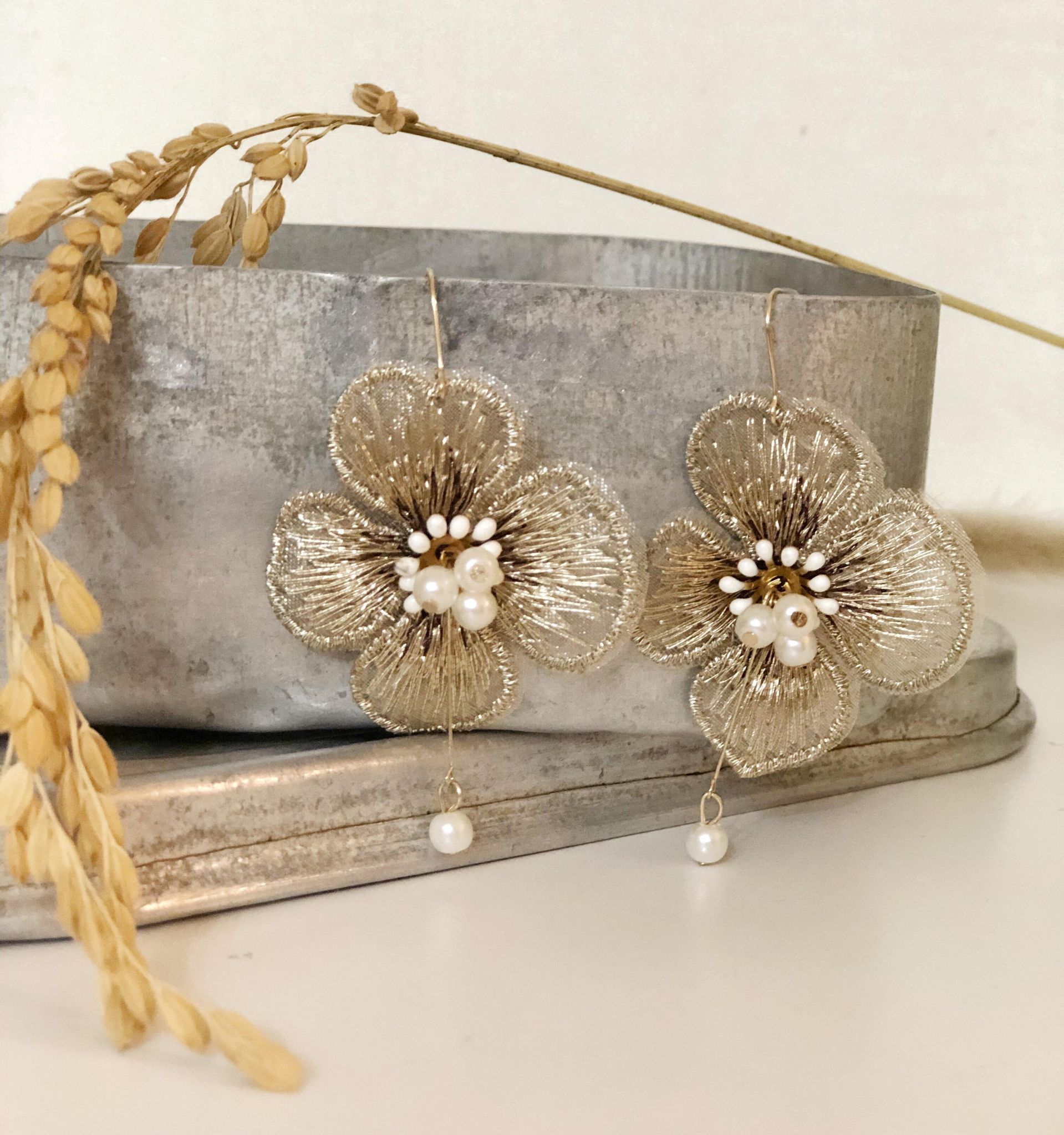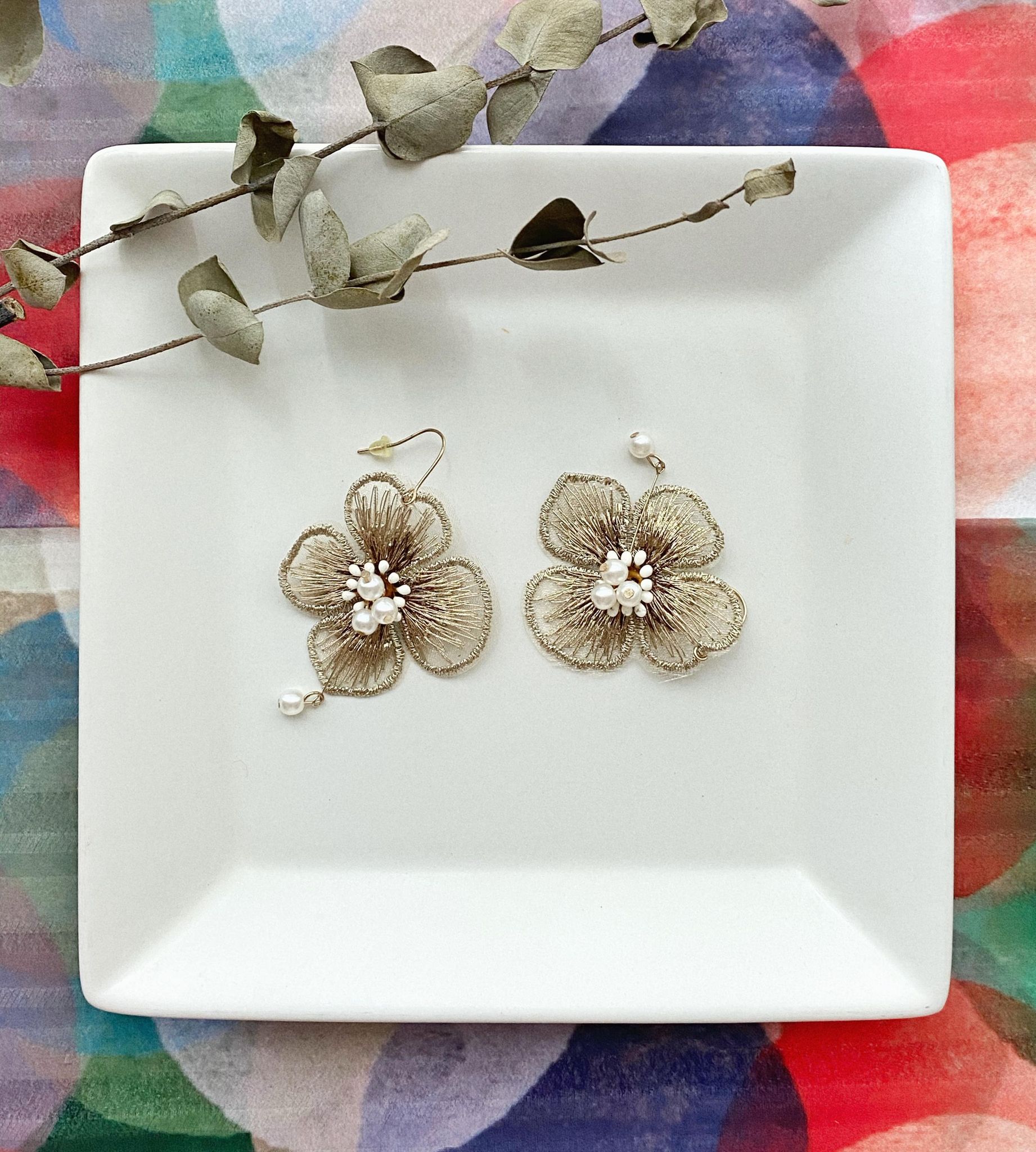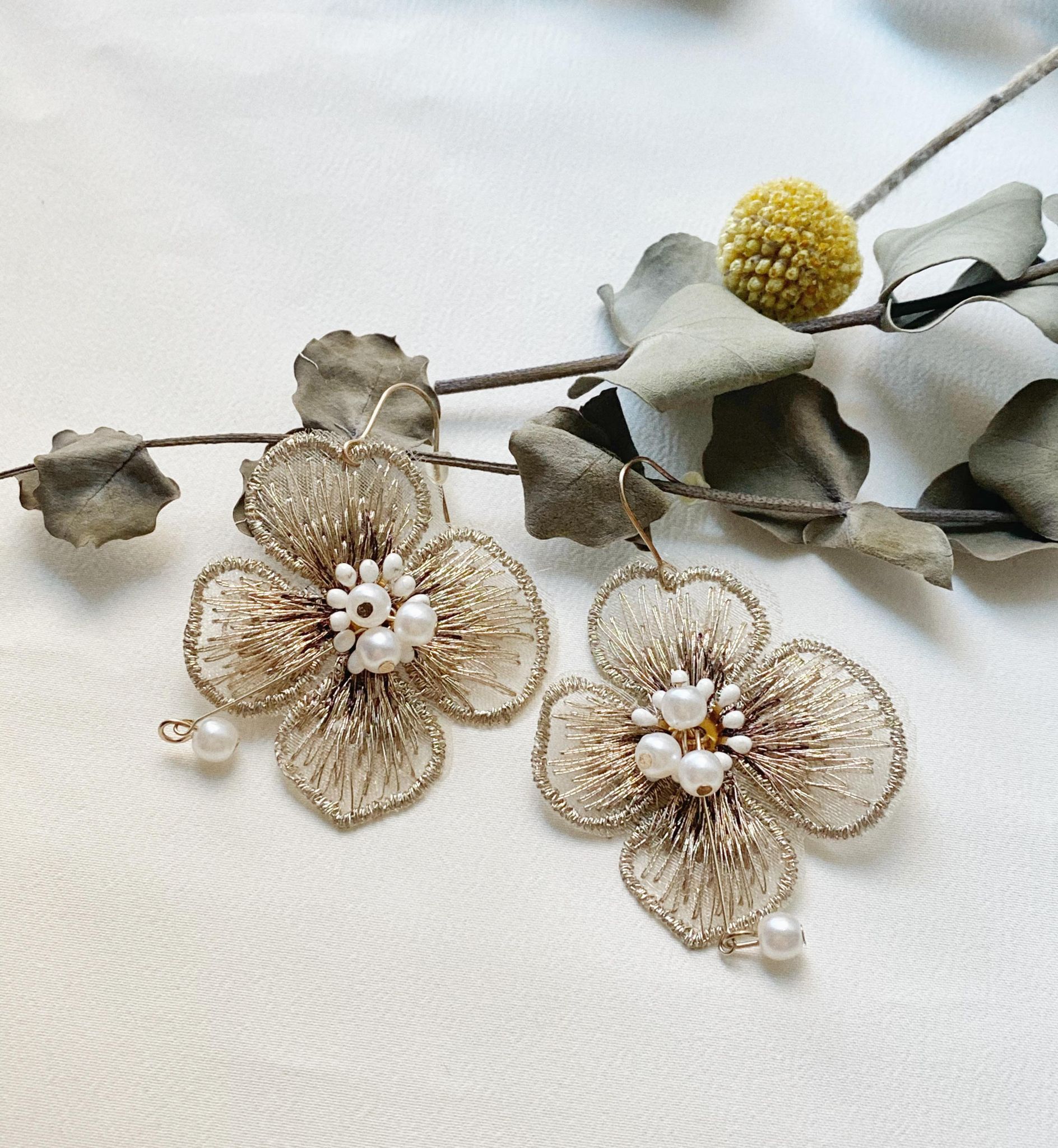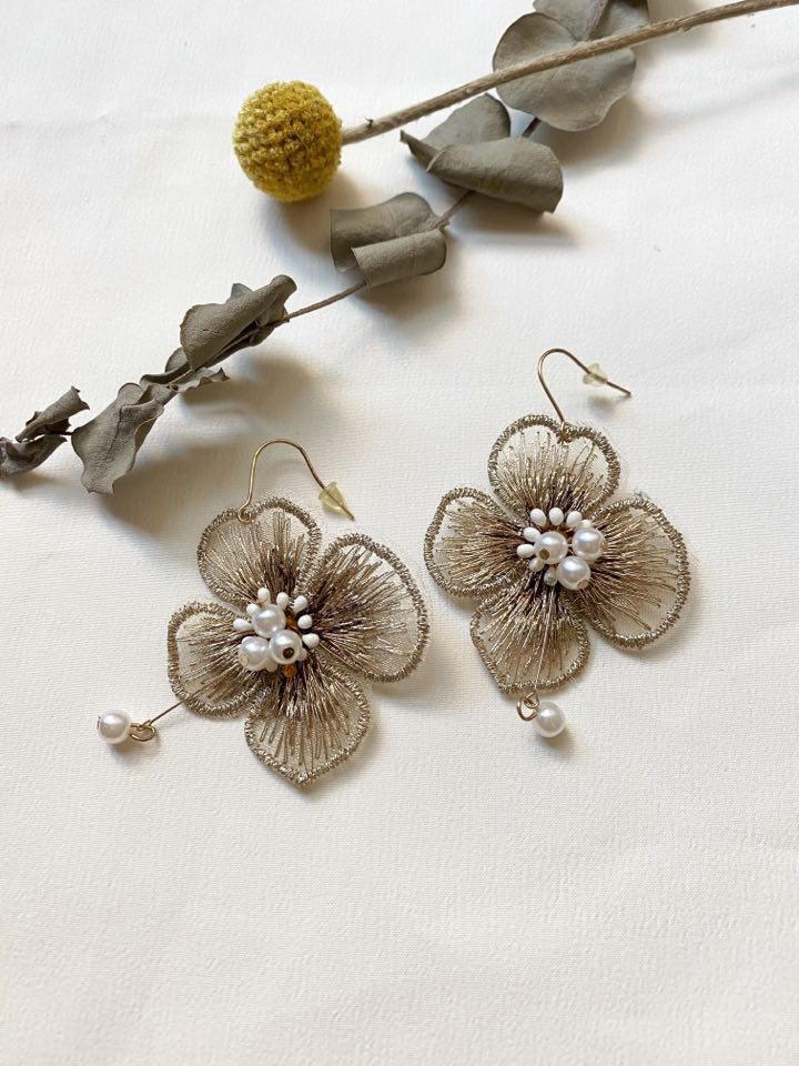 金絲銀杏小珍珠耳環